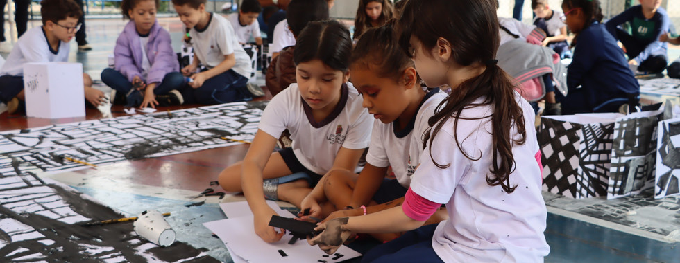 O artista explicou que a dinâmica era fazer linhas retas em um papel branco, que estava no meio da quadra, usando tinta preta as crianças receberam pincéis e liberaram seu lado artístico. Após um determinado tempo e de preencher todo o papel, Ieltxu liberou os mesmos formatos tridimensionais, usados no início, para que cada dupla pudesse fazer a sua própria obra de arte com tinta, recortes e giz.